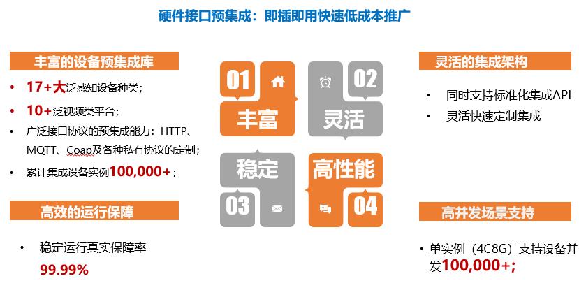 迄今3044永利集团公司已经预集成17+大泛感知设备种类,10+泛视频类平台,广泛接口协议的预集成能力涵盖了HTTP、MQTT、Coap及各种私有协议的定制,累计集成设备实例达100,000+。它还支持标准化集成API,可灵活快速地定制集成,通过构建规则引擎,实现了各设备间的联动应用,比如检测到违规停车,联动广播就会自动播报提醒,为社区管理服务赋能。